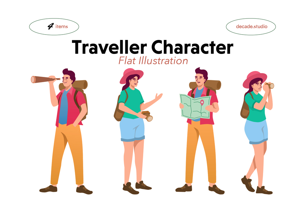 Take a look and find out this beautiful collection of Traveller Character Illustration designs for your creative projects. All graphics are vector and also saved as .PNG. Download and use them in your web designs, mobile apps, presentations or any other projects.